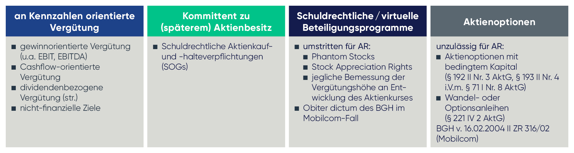 Aktienrechtlich unzulässig ist es, für Aufsichtsratsmitglieder Aktienoptionsprogramme aufzusetzen, die mit Aktien aus einer bedingten Kapitalerhöhung oder mit eigenen Aktien aus einem Rückkauf bedient werden sollen (§§ 192 II Nr. 3, 71 I Nr. 8 AktG). Für die Bedienung von Aktienoptionsprogrammen aus einem Aktienrückkauf stellte dies der BGH im Jahr 2004 in seiner Mobilcom-Entscheidung klar (BGH v. 16.02.2004 II ZR 316/02). Dies gilt auch, soweit Aufsichtsratsmitglieder Begünstigte von Aktienoptionen aus Wandel- oder Optionsanleihen sein sollen (§ 221 Abs. 4 Satz 3 AktG).