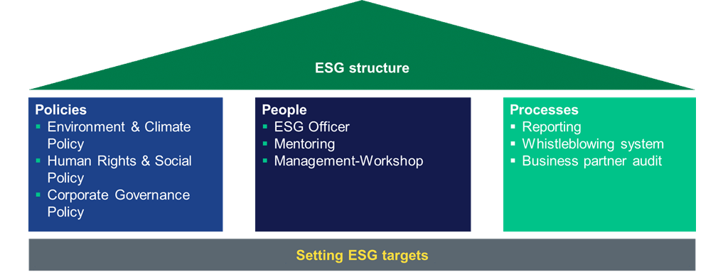 In the next step, these basic questions can be used to define various ESG targets, which can be very general or individually tailored to the company. Experience shows, however, that compiling the “right” questions and deriving the appropriate targets and measures from them is a great challenge for many companies. In the course of this process, it is usually forgotten that right now, no company can conclusively assess what is “right” and what is “wrong” from an ESG perspective. All companies face the same challenges. The only difference is that one company can afford to set up a large ESG department internally or hire an external consulting team whilst the other can only provide smaller resources for this purpose. Therefore, our advice is to start with a basic set-up when introducing ESG structures and then add to it gradually as it develops. Such a basic structure could be based on three pillars and be organised as follows: